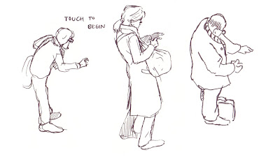When drawing people quickly, I have a habit of drawing from top to bottom (or the torso first), but they are always gone before I can get a good look at the legs! And so, often, I ruin a sketch because the legs weren't as observed and are just these dangly things, floating. I thought maybe I would spend less time on the upper body and focus on the legs. That way, hopefully, i'll get good enough at doing legs that even if the subject moves off, I would still know how to do 'em! :)